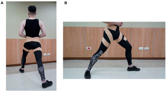 Demonstration of the dynamic tape applied on the bilateral hip. (A) Posterior view, (B) side view. The dynamic tape started from the vastus medialis obliquus and wrapped around the thigh in a superolateral direction to the posterior thigh, went to the proximal medial thigh, and then wrapped the thigh below the anterior superior iliac crest in a superolateral direction. After that, the dynamic tape crossed the low back to the contra-lateral lower quarter abdomen. The dynamic tape was applied on both hip joints.