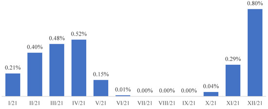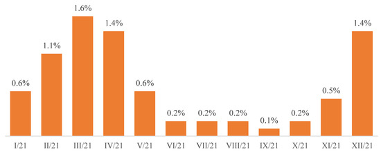 From 1 January to 31 December 2021, 2065 cases of SARS CoV-2 infection were detected among inmates, and 5707 inmates were referred to quarantine. In the period from January to April, the number of infected inmates increased. That period covers 55.01% of all infections. Since May, a decrease in the number of infected inmates has been observed. Another increase in cases was observed, starting from October 2021. The highest number of infections occurred in December 2021 (575, or 27.84% of all infections).