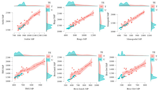 Mean power (MP) and maximum power (MaP) in the push-up exercise for untrained (U) and trained (T) groups based on experience (TE) for unstable performance tasks, measured in watts. Notes: The figure shows the two variables analyzed in each execution. On the X axis the values of mean power and on the Y axis the values of maximum power. The colors show the different groups: trained in pink and untrained in blue. The dots represent the values of the subjects and the dispersion. A line representing the trend has also been added and the colored areas are the confidence intervals. On both axes, the density of the points according to the categorization of the subjects is also represented.