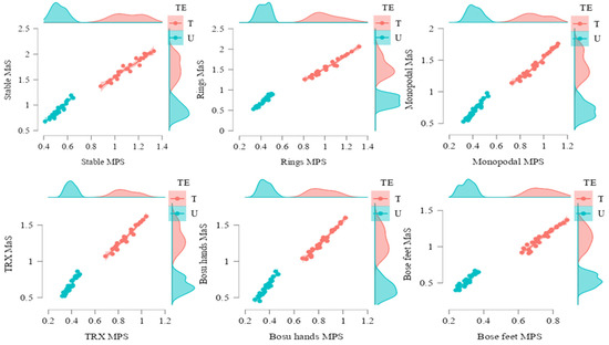 Mean propulsive speed (MPS) and maximum speed (MaS) in the push-up exercise for untrained (U) and trained (T) groups based on experience (TE) for unstable performance tasks, measured in meters/second (m/s). Notes: The figure shows the two variables analyzed in each execution. On the X axis the values of mean propulsive speed and on the Y axis the values of maximum speed. The colors show the different groups, trained in pink and untrained in blue. The dots represent the values of the subjects and the dispersion. A line representing the trend has also been added and the colored areas are the confidence intervals. On both axes the density of the points according to the categorization of the subjects is also represented.