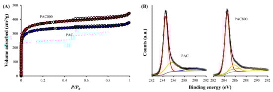 The specific surface area (SBET), total pore volume (Vp), and average pore diameter (dp) increased after thermal treatment at 800 °C (Table 1). Both PAC and PAC800 showed a combination of Type I(b) and Type II isotherms with an H4 hysteresis loop, suggesting that their pores consist of micro-, meso-, and macropores [50,51] (Figure 1A). However, it is also indicated that the pores of PAC800 have a wider size distribution, as supported by the distribution of mesopores and micropores presented in Figure S2A,B. It is also observed that PAC800 has smaller meso- and micropores than PAC. Therefore, the higher dp of PAC800 compared to PAC is attributable to the larger amount of macropores in PAC800 than in PAC. This suggests that the thermal treatment of the PAC increased the number of macropores, as well as micro- and mesopores.