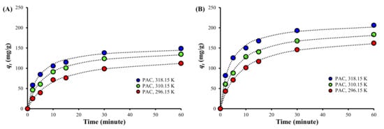 Batch adsorption kinetic experiments were conducted in a 250 mL four-neck round flask placed in a heating mantle (MS3040, Misung Scientific Co., Ltd., Yangju, Korea) at 296.15, 310.15, and 318.15 K. The 0.08 g of the PACs were dispersed in 180 mL DDIW by mixing at 250 rpm and then, the 20 mL TC stock solution was introduced so that the initial TC concentration was 100 mg/L, to start adsorption. Samples were taken at 2, 5, 10, 15, 30, and 60 min, and filtered through a 0.45 μm PVDF filter.