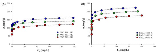 The Temkin isotherm was a poor fit although heterogeneity was also assumed. However, a linear and a logarithmic decrease in the adsorption heat is well described by the Temkin and Freundlich isotherms, respectively [69]. Therefore, it is suggested that the adsorption energy decreases logarithmically with an increasing surface coverage of both PAC and PAC800.