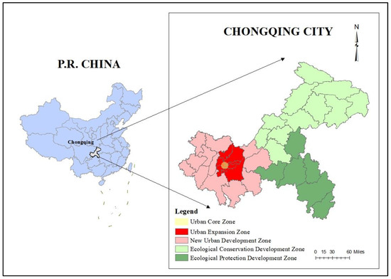 Among these trials of the Link Policy, the model of Chongqing has been regarded as a successful policy innovation from the supply side of land resources. As shown in Figure 1, Chongqing is the only municipality in inland China and serves as the economic center of the upper Yangtze River area, which has an area of 82.4 thousand km2 and a population of 32.12 million (as of 2021). It has five major functional zones: Core Urban Zone, Expansion Urban Zone, New Urban Development Zone, Ecological Conservation Development Zone and Ecological Protection Development Zone. However, significant disparities do exist among regions, including urban and rural natural conditions, resource endowments, development status and development potentials.