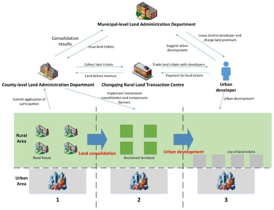 Aiming to address the urban–rural development disparities, Chongqing was selected as one of two pilot areas to implement the Comprehensive Reform for Urban–Rural Integrated Development in 2007. Following this strategy, the implementation of the Link Policy has been taken as an effective policy instrument to coordinate urban and rural development. Different from the traditional practice, the policy implementation in Chongqing was termed the Land Ticket Transaction. “Land ticket” is a metaphorical expression of the tradable land use quota generated by rural construction land consolidation, and these quotas can be traded, crossing the boundary of the township with the approval of the central government [30,31,53]. The trading platform, called the Chongqing Rural Land Transaction Centre (CRLTC), was established in 2008 and was in charge of responsibilities including the registration and administration of property rights; transactions of rural property rights; distribution of land quota revenues; and offering consultations for property rights selling, bidding and auction.