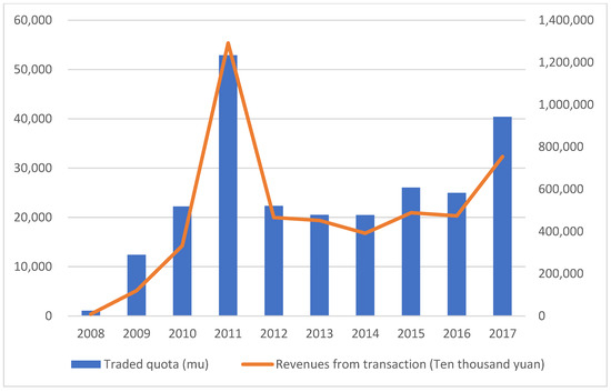 Since its adoption, Land Ticket Program has been widely reported as a successful instrument for coordinating urban and rural development with market approaches. It created tremendous land revenue and boosted the local economy. As of 2017, more than 0.24 million mu land tickets have been created and traded, with more than CNY 47.8 billion in land revenue [63]. The trend of land ticket transactions from 2008 to 2017 is shown in Figure 3.
