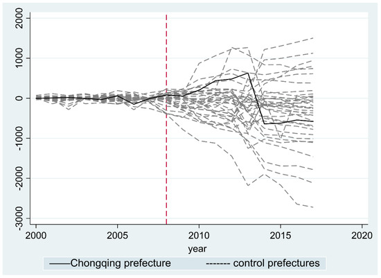 Additionally, the robustness test was supplemented with a placebo test to make the modeling results more reliable. Prior to that, prefectures with larger root mean square percentage error (RMSPE) values in the SCM were removed given that a larger RMSPE indicates the bad imitative effect of the synthetic group before the policy was implemented. The removed prefectures are places with a value of RMSPE over 1.5 times that of Chongqing, including Ziyang, Jingmen, Changsha, Xiaogan, Xiangxi, Bijie Guangyuan, Neijiang, Shiyan, Nanchong, Guang’an, Guiyang and Liupanshui. The final robustness test result can be found in Figure 6, indicating the different distributions of the rest of the prefectures, in which the solid line indicates Chongqing and the dotted lines indicate other prefectures.