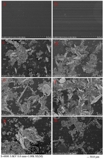 SEM images of plastic debris. (a) Virgin PP; (b) virgin PET; (c) biofilm-covered PP in Xuanwu Lake; (d) biofilm-covered PET in Xuanwu Lake; (e) biofilm-covered PP in Donghu Lake; (f) biofilm-covered PET in Donghu Lake; (g) biofilm-covered PP in Qinhuai River; and (h) biofilm-covered PET in Qinhuai River.