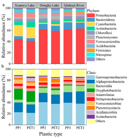 The abundance of bacteria at the phylum level (a) and class level (b) in biofilms on plastic debris. PP1 and PET1: biofilm-covered plastic in Xuanwu Lake; PP2 and PET2: biofilm-covered plastic in Donghu Lake; and PP3 and PET3: biofilm-covered plastic in the Qinhuai River.