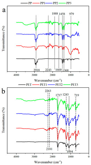The infrared spectra of the PP plastic debris showed that the absorption peaks of methyl appear at 2918 cm−1 and 1368 cm−1; the twisting deformation vibration of the methyl group overlaps with that of methylene and this absorption peak slightly shifts to 1458 cm−1, =C-H at 979 cm−1. Furthermore, for the biofilm-covered PP, -N=C=O at 2243 cm−1, C=O at 1888 cm−1 and 1660 cm−1 were also observed, respectively.