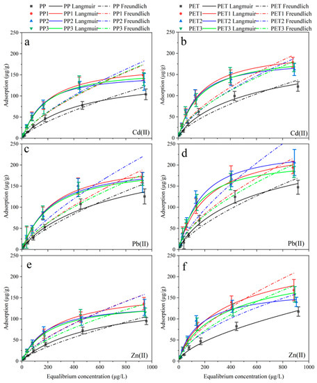 Adsorption isotherms of the Cd(II) (a,b), Pb(II) (c,d) and Zn(II) (e,f) for plastic debris. PP and PET: virgin plastic; PP1 and PET1: biofilm-covered plastic in Xuanwu Lake; PP2 and PET2: biofilm-covered plastic in Donghu Lake; PP3 and PET3: biofilm-covered plastic in the Qinhuai River.
