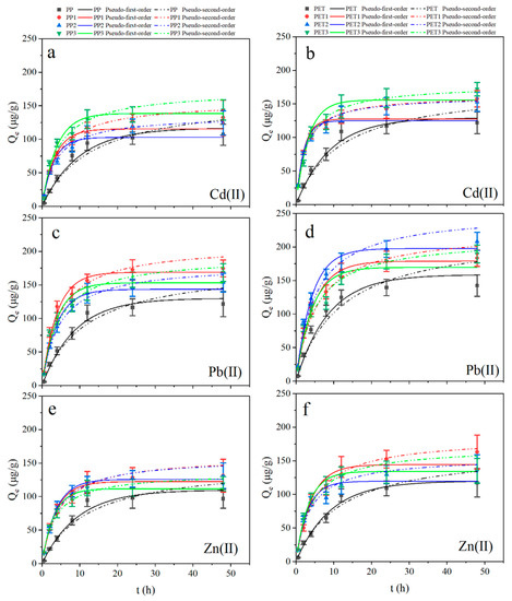 The curves of adsorption kinetics for Zn(II), Cd(II) and Pb(II) on PP, PET, biofilm-covered PP and biofilm-covered PET (using the pseudo-first-order and pseudo-second-order models) are shown in Figure 5 and Table 2. Accordingly, most adsorption capacity was attained within 12 h. After that, the metal adsorption reached a quasi-equilibrium.