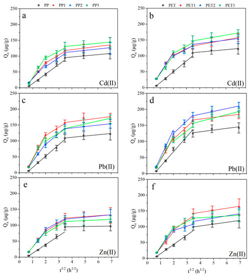 Intraparticle diffusion curves of Cd(II) (a,b), Pb(II) (c,d) and Zn(II) (e,f) for plastic debris. PP and PET: virgin plastic; PP1 and PET1: biofilm-covered plastic in Xuanwu Lake; PP2 and PET2: biofilm-covered plastic in Donghu Lake; PP3 and PET3: biofilm-covered plastic in the Qinhuai River.