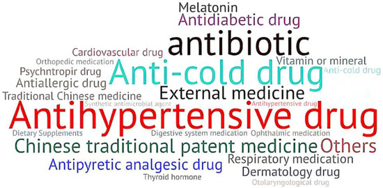 The first multiple-choice question was “What kinds of OTC drugs have you ever purchased and used?”, and its 10 options were (1) antipyretic analgesics (e.g., paracetamol); (2) digestive system drugs (e.g., ranitidine hydrochloride capsules); (3) respiratory system drugs (e.g., aminocaffeine tablets); (4) vitamins/minerals (e.g., vitamin C tablets); (5) antibacterial drugs (e.g., metronidazole buccal tablets); (6) drugs for external use (e.g., compound beclomethasone camphor cream); (7) Chinese patent drugs (e.g., Xiao Chai Hu granules, Xiao Jianzhong granules, Sijunzi pills); (8) gynecological drugs (e.g., miconazole nitrate suppositories); (9) anti-allergic drugs (e.g., loratadine capsules); (10) others. For this multiple-choice question, the number of options available to the respondents could be 1–10. In the data analysis, for the respondents who selected the “other” option, the content filled in by the respondents was categorized, and a word frequency cloud map was drawn.
