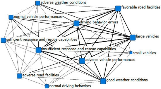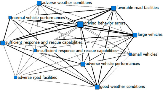 We transform the case data into a truth table based on the operational definition and assignment rules of the variables. By considering the membership degree of 0.5 as the boundary and the conditional configuration as the accident chain, we draw a social network analysis diagram to visually present the 42 accident causal combinations, as shown in Figure 2 and Figure 3. From the perspective of network structure indicators, it shows the differences between the causes of particularly major accidents and general accidents. The size of the point in Figure 2 and Figure 3 is adjusted based on the degree, and the thickness of the connection is adjusted according to the strength of the association. The three major causes of major road accidents are vehicle types, driving behaviors, and response and rescue capabilities based on the rank of the network degree centrality, while the three major causes of general road accidents include driving behaviors, favorable road facilities, and vehicle types. At the same time, it is obvious that there are differences in the number of nodes, the size of nodes, and the closeness of connections between major accidents and general accidents.