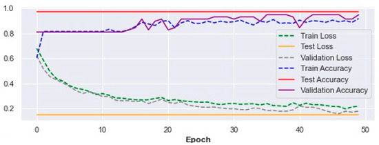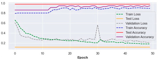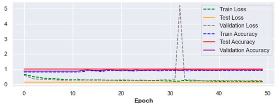 The trend of improvement in the accuracy of fall prediction for training, testing, and validation with their corresponding loss (Equation (4)) values over 50 epochs in the 5p-SAFE are shown in Figure 4 below.