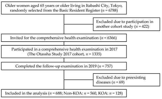 This cross-sectional study utilized data from a cohort study with a comprehensive health examination, “the Otassha study 2017 cohort” [17,18] conducted by the Tokyo Metropolitan Institute of Gerontology. Older women aged 65 years or older living in Itabashi, Tokyo, Japan were recruited using the Basic Resident Register (n = 6788) in 2017. After excluding 422 women who participated in another cohort study, we sent out invitation letters to 6366 candidates. A total of 1335 women participated in the health examination in 2017. Of them, 757 women (56.7%) completed the follow-up examination in 2019. Additionally, 69 women were excluded for Mini-Mental State Examination < 23 points (n = 6); brain disease (n = 22); stroke (n = 14); rheumatism and other collagen dis-eases (n = 24); dementia (n = 1); and Parkinson’s disease (n = 2); leaving 688 women for analysis (Figure 1).