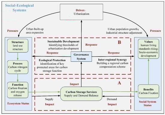 Mega-urban agglomeration is facing increasing pressure on resources and ecology in the development process [2]. We have therefore constructed a SES framework that combines the ES cascade with the DPSIR model. The framework allows for a comprehensive analysis of the impact of urbanization on sustainable development, and it considers responsive management measures for urbanization drivers, ecological subsystems and social subsystems, facilitating the reconciliation of urbanization with the ecological environment. Using YRD as an example, we applied the SES framework to demonstrate the impact of urbanization on CSD and proposed countermeasures to facilitate YRD to achieve their carbon peaking and carbon neutrality targets. Consistent with former research [15,48,49,50], we found that carbon storage supply decreased and carbon storage demand increased in YRD with rapid urbanization, so it is necessary to strengthen the construction of a priority conservation area for carbon storage supply, while constructing a scientific carbon compensation scheme and setting reasonable urbanization development goals. This study revealed the coupling mechanism between the ecosystem process following the laws of nature and the urbanization development process following the laws of humanity, explored the interaction between urbanization and CSD in mega-urban agglomeration, proposed targeted ecological management measures to make up for the lack of research on the response of CSD to urbanization, promoted the sustainable development of urbanization and CSD in YRD, and provided a reference for other mega-urban agglomeration to carry out research on the interaction between urbanization and CSD.