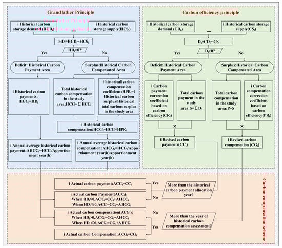 Accurate accounting of carbon compensation is vital for establishing carbon compensation mechanisms. The existing carbon compensation accounting is mainly based on the carbon deficit or carbon efficiency principle [45,46], but ignores the historical carbon emission differences of each region. Therefore, this study combined the grandfather principle and the carbon efficiency principle to construct an inter-regional carbon compensation scheme (Figure 3).