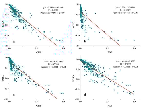 Linear regression model showing the CSDR dependency of integrated urbanization indicator CUL and each urbanization indicators in 2020.