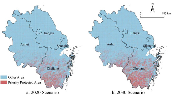 Marxan model simulation results depicted that 8.60% of the area of YRD’s priority protected areas for carbon storage supply in the 2020 scenario were located in the western and southern of Anhui, and the western and southern of Zhejiang. Forest ecosystems in these areas were well preserved and had strong capacities for carbon storage. Besides, these areas were mainly hilly and mountainous terrain unsuitable for diverse human activities, so their level of urbanization and carbon storage demand were relatively lower. In the 2030 scenario, carbon storage supply priority reserves in YRD should expand to 12.58% of its total area to meet the carbon peak demand. Anhui and Zhejiang provinces are still responsible for providing most of the carbon storage. Jiangsu province and Shanghai have limited space suitable for carbon storage supply due to their low forest cover and high ecological conservation costs.