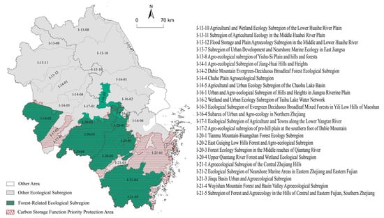 Comparing the priority carbon storage function reserves with the established ecological function zoning scheme (data from the China Ecological Function Zoning Database: https://www.ecosystem.csdb.cn/ecoass/ecoplanning.jsp, accessed on 27 June 2022), the area of subregions related to forest protection is 100,600 km2, accounting for 28.09% of the total area of YRD. The area of priority carbon storage reserves is 24,300 km2, which is larger than the forest-related subregions in existing ecological function zoning scheme. The additional priority carbon storage reserves are mainly distributed along the Yangtze River in southwest of Anhui province and the hilly area in central of Zhejiang province. In the existing ecological function zoning scheme, these areas were designated as agroecological subregions (Figure 9, I-17-1, I-17-2, I-21-1). Additionally, the Yili low-hill mixed-evergreen deciduous broad-leaved forest ecological subregion (Figure 9, I-16-3) in Maoshan was excluded because of its intensive human activities and high level of urbanization.