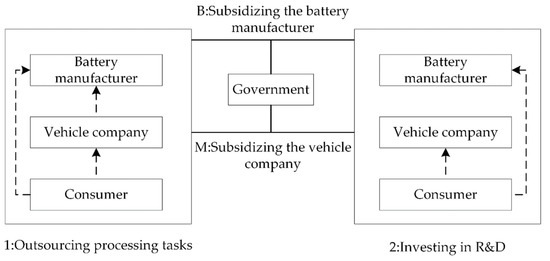 The main research object of this paper is the supply chain composed of a battery manufacturer and a vehicle company, as shown in Figure 1. Both the battery manufacturer and the vehicle company can recycle waste batteries. Besides, the battery manufacturer is not only responsible for recycling but can also benefit from processing waste batteries and the vehicle company has two strategies: outsourcing processing tasks or investing in R&D. In order to promote enterprises in recycling waste batteries, the government has two subsidy strategies: subsidizing the battery manufacturer or subsidizing the vehicle company. The decision-making process of the battery manufacturer and the vehicle company is as follows: when the vehicle company outsources processing tasks, first the battery manufacturer decides the commissioned recycling price of waste batteries, then the battery manufacturer and the vehicle company respectively decide their own recycling price for waste batteries according to the commissioned recycling price; When the vehicle company invests in R&D, the battery manufacturer and the vehicle company only need to decide their own recycling price for waste batteries.