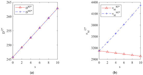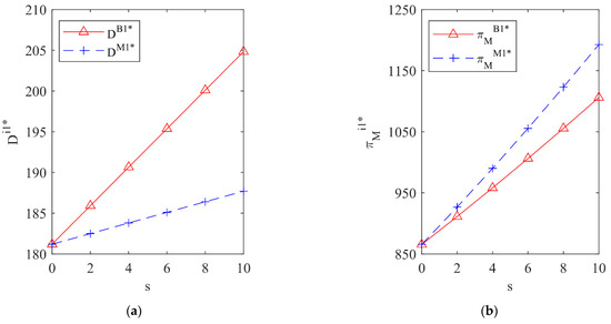 Table 1 shows the impact of the unit subsidy on equilibrium decisions under four models. It can be seen from Table 1 that: (1) With the increase in the unit subsidy, the total recycling volume of waste batteries under four models will increase. This shows that, no matter what strategy the government and the vehicle company take, government subsidies can always increase the total recycling volume of waste batteries. This is consistent with some existing studies [20,21,35], i.e., government subsidies can increase the total recycling volume of waste batteries. The difference is that this paper further studies the influence of government subsidies on the total recycling volume of waste batteries under different government subsidy objects and different processing decisions of vehicle companies and considers the situation more comprehensively. (2) With the increase in the unit subsidy, the equilibrium decisions under Model B1 will increase, while the commissioned recycling price, the recycling price and the recycling volume of waste batteries will decrease under Model M1. This shows that it is beneficial for the government to subsidize the battery manufacturer when the vehicle company outsources processing tasks. However, when the government subsidizes the vehicle company, with the increase of the unit subsidy, the battery manufacturer will divide the subsidies received by the vehicle manufacturer by reducing the commissioned recycling price and the enthusiasm of the battery manufacturer will also be reduced. This is consistent with the research [24]. In Model B1 and Model M1, the vehicle company outsources recycled waste batteries to the battery manufacturer. At this time, the battery manufacturer is the leader of the Stackelberg game and the vehicle company is a follower, which shows that, when the government subsidizes the battery manufacturer, the battery manufacturer will increase the commissioned recycling price of waste batteries. When the government subsidizes the vehicle company, the battery manufacturer will reduce the commissioned recycling price. (3) With the increase in the unit subsidy, the recycling volume and the profit of the vehicle manufacturer under Model B2 will decrease and the recycling volume and the profit of the battery manufacturer under Model M2 will decrease. This is because, when the vehicle company invests in R&D, the battery manufacturer and the vehicle company form perfect competition and subsidies to the battery manufacturer are unfavorable for the vehicle company. Similarly, subsidies to the vehicle company are unfavorable for the battery manufacturer. This is consistent with research [32], i.e., the competition among supply chain members will reduce the recovery rate of waste products, which is not conducive to the development of the supply chain.