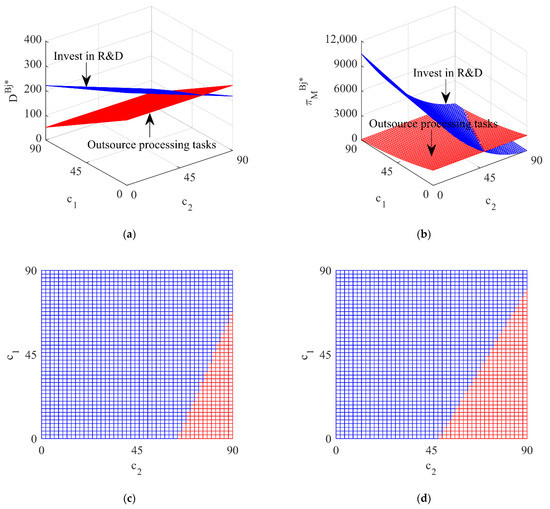 Table 2 shows the impact of the battery manufacturer’s unit processing cost and the vehicle manufacturer’s unit processing cost on equilibrium decisions under four models. It can be seen from Table 2 that: (1) With the increase in the unit processing cost, the total recycling volume of waste batteries under four models will decrease. (2) With the increase in the battery manufacturer’s unit processing cost, equilibrium decisions in Model B1 and Model M1 will decrease. This is because, in Model B1 and Model M1, the vehicle company and the battery manufacturer are a community of interests and the increase in the unit processing cost of the battery manufacturer will have a negative effect on the vehicle company. (3) With the increase in the battery manufacturer’s unit processing cost, the recycling volume and the profit of the vehicle company in Model B2 and Model M2 will increase. Similarly, with the increase in the vehicle company’s unit processing cost, the recycling volume and the profit of the battery manufacturer in Model B2 and Model M2 will increase. This is because in Model B2 and Model M2, the battery manufacturer and the vehicle company form perfect competition and the increase in the battery manufacturer’s unit processing cost is beneficial to the vehicle company. Similarly, the increase in the vehicle company’s unit processing cost is also beneficial for the battery manufacturer. This is consistent with research [23], i.e., with the increase of the processing cost of unit waste battery, the total recycling volume of waste batteries will also decrease and the impact of the increase of processing cost on the profits of each member of the supply chain is different.