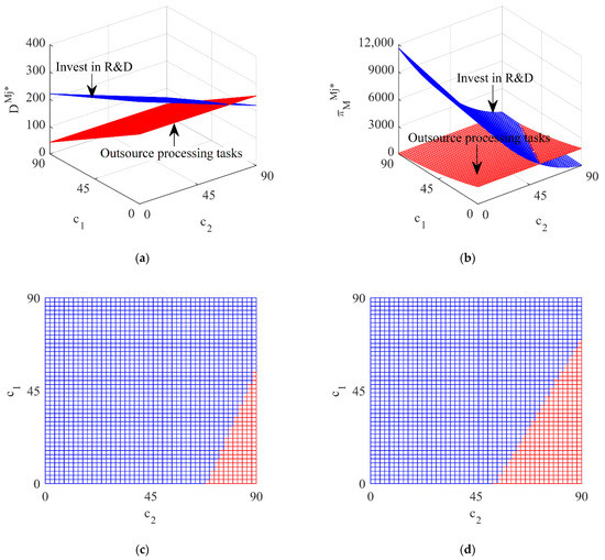 (1) In most cases, vehicle companies are “assembly plants” that do not have technologies for battery production, disassembly and processing, while battery manufacturers have battery production technology and can consider the use of raw materials and the difficulty of recycling and dismantling in the process of battery R&D. Therefore, battery manufacturers have more advantages in processing waste batteries [36]. Considering the above situations, this paper assumes that the battery manufacturer has the ability to process waste batteries in the outsourcing processing mode, assuming that the vehicle manufacturer outsources processing tasks to the battery manufacturer, and in the investing in R&D mode, assuming that the vehicle company invests in R&D and processes waste batteries by itself.