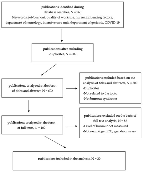 The paper includes articles that met the following inclusion criteria: (1) presentation of original results, (2) published full reports and research results, (3) study group—nurses, (4) reporting short- and/or long-term outcome, (5) quantitative studies, (6) publication date from 2017 to 2022, (7) research using psychometric tools with high measurement reliability, (8) research conducted among nurses employed in one of the following departments: neurology, geriatric, intensive care unit, patients with COVID-19, (9) publications were in English. The exclusion criteria were: (1) case studies, short reports, (2) article written in different language than English, (3) small sample size < 49.