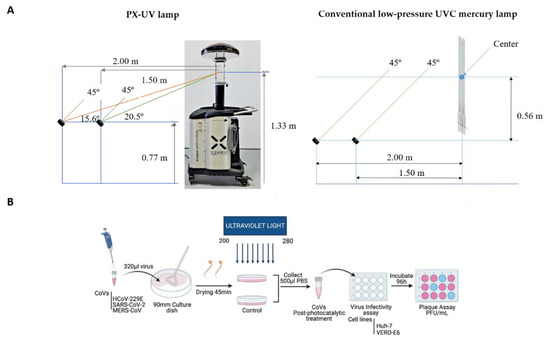 Schematic representation of the experimental conditions. (A) The UV light doses that samples received were measured by a detector anchored with an inclination of 45° and distances of 1.5 and 2 m with respect to the emission source. Distances were measured using a telemeter and the slope using a clinometer. (B) A 320 μL drop of DMEM, containing 105 pfu of MERS-CoV, SARS-CoV-2, or HCoV-229E, was deposited on a 90 mm culture plate, spread, and dried for 45 min. After drying, viruses were irradiated with PX-UV for different time periods (0.5, 1, 2, 3, 4, and 5 min) at a 1.5 m or 2 m distance. Viruses were then collected in 500 µL of PBS to determine the infectivity by a plaque assay in Huh-7 (HCoV-229E and MERS-CoV) or Vero E6 (SARS-CoV-2) cell lines. This illustration was created with Biorender.com.