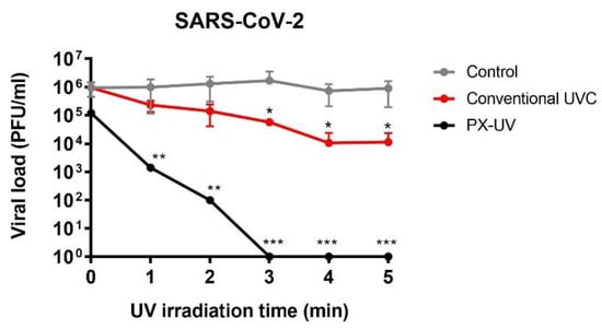 Comparison between the efficacy of conventional mercury UVC light and PX-UVC light in the decontamination of SARS-CoV-2 on plastic surfaces. A drop of 320 μL of SARS-CoV-2 was deposited and spread on a cell culture plate, as described in Figure 2. The virus was exposed to PX-UV light or conventional mercury UVC light for the indicated time at a 1.5 m or 2 m distance, respectively. Non-UV-treated controls were included in this experiment. Viruses collected from controls or after exposure to irradiation were titered. Viral load is represented as the mean of biological duplicates. Error bars indicate s.d. Viral titers of mock-irradiated samples remained constant in time. Statistical differences between treated and control groups are indicated: * p < 0.05; ** p < 0.01; *** p < 0.001).