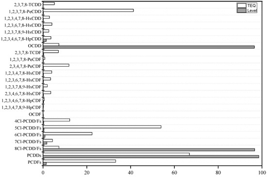 Level and TEQ contributions of congeners to total PCDD/Fs are shown in Figure 1. Among the PCDD/F levels, OCDD was the predominant congener, accounting for 96.5%. The ratios of PCDDs and PCDFs to total PCDD/Fs were 98.6% and 1.4%, respectively. The ratios of tetra- (0.3%), penta- (0.4%), hexa- (0.9%), hepta- (1.7%), and octa-chlorinated (96.6%) congeners were enriched with increasing amounts of chlorine. For TEQs, 1,2,3,7,8-PeCDD was the dominant congener, accounting for 41.3%, followed by 2,3,4,7,8-PeCDF (11.8%). The mean contribution of PCDDs to ∑TEQs was 66.8%, and that of PCDFs was 33.2%.