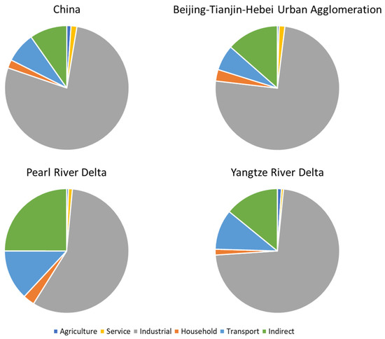 We first analyzed the structure of carbon emissions in China and the three largest urban agglomerations (Figure 1). For the entire country, the CO2 emissions from the industrial sector were considerably dominant (78%), followed by indirect (10%), transportation (8%), and household (2%) emissions. Compared to the national emission structure, indirect emissions took a larger proportion in three megaregions, especially in the Pearl River Delta (25%), and the proportion of transportation emissions in the Pearl River Delta (13%) and Yangtze River Delta (10%) was larger, while the proportion of industrial emissions in the Pearl River Delta (57%) was smaller.