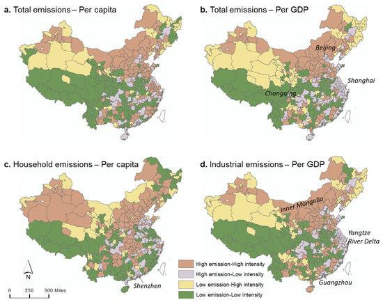 We further presented the emission types in terms of the major sector, industrial emissions (Figure 2d), and household emissions representing residential energy-use behaviors (Figure 2c). For household emissions, most cities with high emissions also have high per capita emissions, indicating a low-efficient behavior of residential energy use. Such noteworthy cities were concentrated in Northern China and Central China. Residential people in megacities such as Shanghai and Shenzhen perform well with low per capita emissions. For industrial emissions, the industrial cities in the North (e.g., Inner Mongolia, Shanxi province, Anshan) primarily belong to the High–High type, but those in the South and coastal cities (e.g., Chongqing, Guangzhou, Yangtze River Delta) were classified as the high–low type with low emission intensities.
