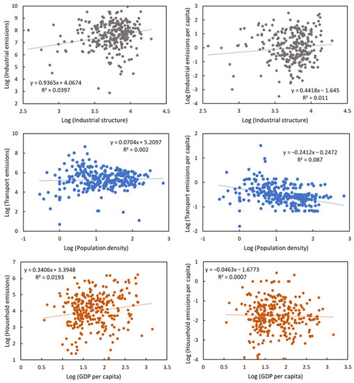 The direct CO2 emissions and emission intensities of three major sectors were related to the corresponding socio-economic factors. First, we investigated the relations between industrial emissions and the industrial structure (proportion of the secondary sector of the economy). The industrial structure was positively associated with both industrial emissions and per capita emissions, indicating that a greater proportion of the secondary industry tends to increase the industrial emissions and emission intensity (Figure 3). Second, we explored the relationship between transportation emissions and population density. Cities with a higher population density tend to have more transportation emissions but fewer per capita transportation emissions. Third, higher income levels, represented by GDP per capita, were linked to more household emissions across cities. Overall, economic development and population growth had negative relations to emission intensity.
