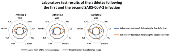 Radar charts of the laboratory tests following the first SARS-CoV-2 infection (blue line) and the reinfection (orange line) in the three athletes. Athletes 2 and 3 had practically no relevant alterations at the first and the second examinations. Athlete 1 presented with increased serum ferritin levels at the first examination, which persisted at the second return-to-play assessments as well. Moreover, mildly elevated D-dimer levels were also found at the second laboratory test in this subject. Abbreviations: WBC: white blood cell count, Neu: neutrophil count, Ly: lymphocyte count, Thr: thrombocyte count, CRP: C-reactive protein, TnT: troponin-T, IL-6: interleukin-6.