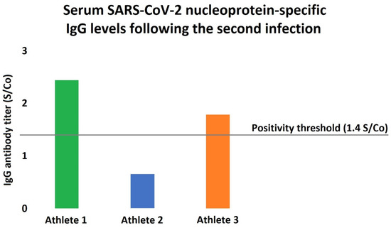 Serum SARS-CoV-2 nucleoprotein-specific antibody levels in the athletes following the reinfection. Humoral immunity was assessed following the second infection, showing only modest increases in the antibody levels. Interestingly, Athlete 2 had an antibody titer significantly below the positivity threshold even after the reinfection, while Athlete 3 also barely exceeded the accepted antibody-positivity level.