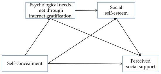 The hypothesized serial mediation model assumes that self-concealment is associated with a lower level of meeting psychological needs through internet gratification, which contributes to decreased social self-esteem, which, in turn, is associated with higher perceived social support.