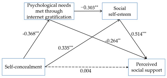 The serial mediation model with ‘psychological needs met through internet gratification’ and social self-esteem’ as mediators of the linkage between ‘self-concealment’ and ‘perceived social support’. Note: ** p < 0.01, *** p < 0.001.