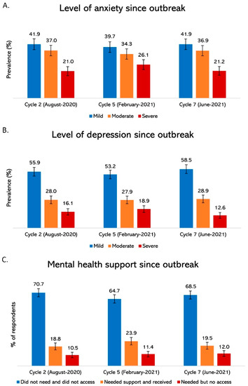 Self-reported anxiety and depression in each study cycle are presented in Figure 1. During study cycles in August 2020 and June 2021, one respondent in five had severe anxiety and one in seven had severe depression. However, in the second, Alpha-driven, pandemic wave (early February 2021), one respondent in 4 (26.1%) reported severe anxiety and nearly one in four reported severe depression. Figure 1C illustrates the prevalence of accessing mental health support since the beginning of the pandemic in Saskatchewan. In June 2021, about 12% of respondents reported needing—but not accessing—mental health support. In February 2021, however, the highest percentage of respondents reported they needed mental health support and received it (23.9%). Prevalence of all three mental health outcomes (i.e., anxiety, depression, and mental health support) based on the demographic and socioeconomic status and equity-seeking characteristics of the study participants are presented in Tables S1–S3.