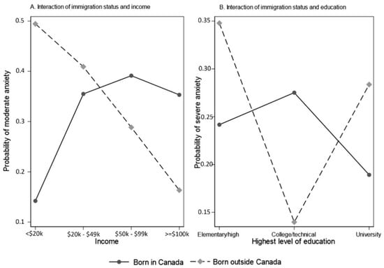 Interaction plots for anxiety: (A) moderate anxiety, income effects moderated by immigration status; and (B) severe anxiety, education effects moderated by immigration status.