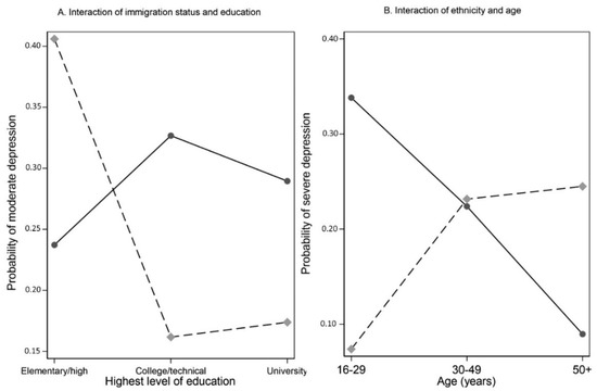 Interaction plots for depression: (A) moderate depression, education effects moderated by immigration status; and (B) severe depression, age effects moderated by ethnicity.