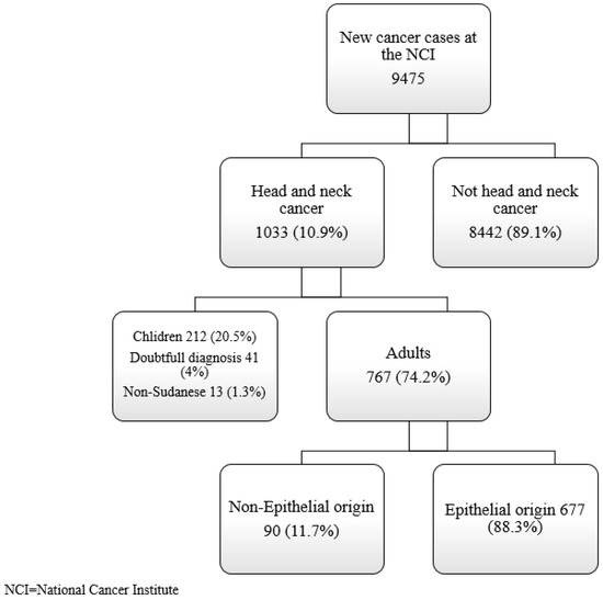 HNC is the seventh most frequent cancer in the world and causes significant morbidity and mortality, with approximately 900,000 new cases and half a million deaths reported annually [6]. In sub-Saharan and Southern Africa, HNC was the fourth most common cancer, while it ranks third in Western Africa [7]. Sudan has one of the highest burdens of HNCs in Africa, as HNCs are the second most common malignancy, while it ranks third, fourth, and fifth in Nigeria, Zambia, and South Africa, respectively [7]. However, epidemiologic studies of HNCs in Sudan are scarce, and thus far, few studies in Sudan have focused on the overall histopathological patterns of head and neck malignancies [8,9]. This study aimed to determine the incidence of HNCs among adult patients at the National Cancer Institute (NCI) in central Sudan and to describe the histological patterns of head and neck tumors in this region.