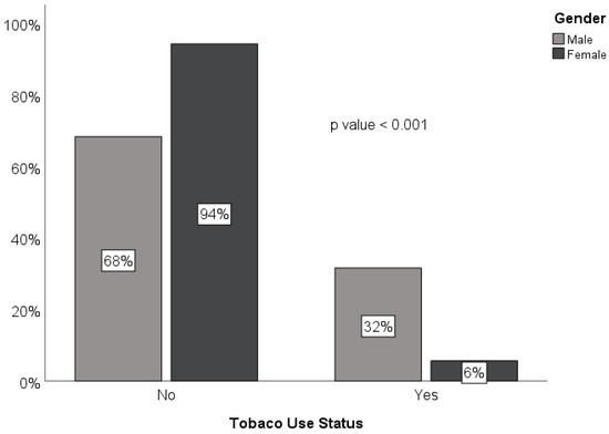 Distribution of tobacco use status by gender.