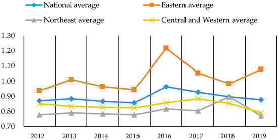 The above index data were brought into MATLAB to derive the green transformation efficiency of the resource industries, and the results are shown in Table 1. Further, the changing trend of the green transformation efficiency of the resource industries is plotted in three major regions, as shown in Figure 2.