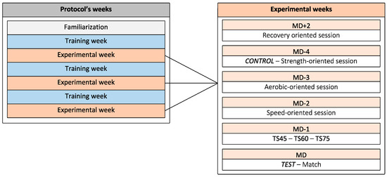 Study flowchart. Training weeks (identical contents) were performed to standardize the fitness level during the following experimental weeks. MD: Matchday; TS45: 45 min training session; TS60: 60 min training session; TS75: 75 min training session.