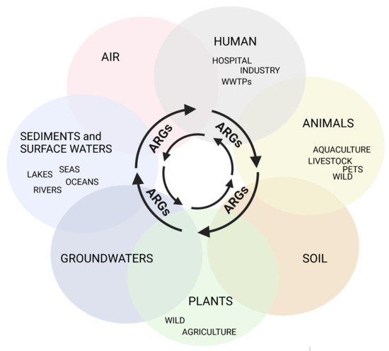 AMR is ubiquitous, associated with agriculture and livestock, medical, and veterinary settings, but it is also observed in many aquatic environments, which is in line with One Health’s concept (available online: https://www.cdc.gov/onehealth/index.html accessed on 23 May 2022) of close interconnections between people, animals, plants, and their shared environments (Figure 1) [7].