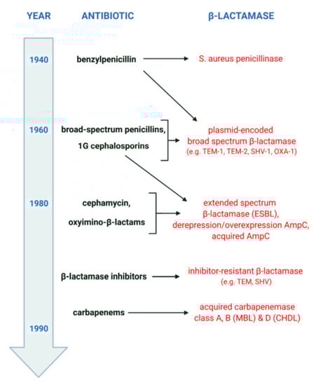 Timeline of the evolution of β-lactamases, created with BioRender (available online: https://biorender.com, accessed on 23 May 2022).